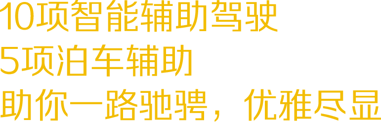10项智能辅助驾驶:自适应巡航、智能过弯、智能巡航辅助、交通拥堵辅助、车道保持、车道居中保持、紧急车道保持、智慧躲闪、交通标志识别、远近光灯智能切换,全面实现L2级智能辅助驾驶系统